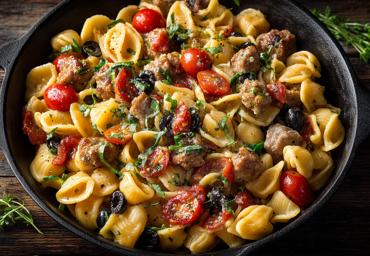 Готовить пасту в одной сковороде — не просто экономия времени, а гарантия насыщенного вкуса. Макароны впитывают ароматы чеснока, колбасы и маслин, превращая простые ингредиенты в гармоничное блюдо.
