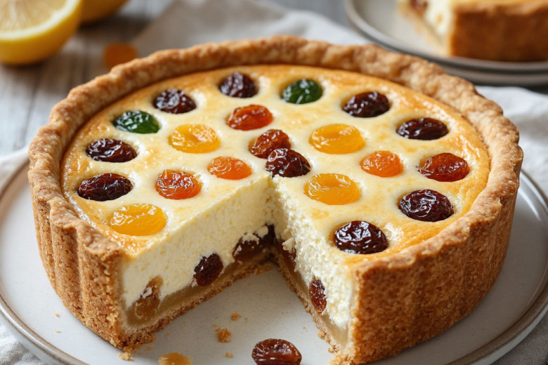 Вам понадобится: 500 г творожной рикотты или протертого творога, 4 яйца, 150 г сахара, 100 г цукатов, 70 г изюма, цедра одного лимона, 1 ч. л. экстракта ванили, 2 ст. л. муки и щепотка соли. Изюм и цукаты (крупные можно нарезать) залейте кипятком на 10 минут, затем обсушите. Духовку разогрейте до 170 °C. Яйца взбейте с сахаром и щепоткой соли до легкого посветления. Аккуратно вмешайте рикотту, ваниль, цедру и муку. В последнюю очередь добавьте изюм и цукаты. Тесто перелейте в форму для выпечки, застеленную пергаментом. Выпекайте около 50–60 минут до золотистого цвета и закрепленного центра. Полностью остудите пирог в форме, после чего уберите в холодильник на несколько часов для окончательного уплотнения текстуры.