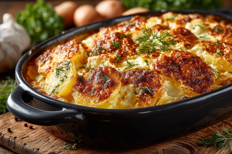 Для приготовления понадобится: 500 вареного картофеля, 2 ст. л. сливочного масла, 2 ст. л. растительного масла, 3-4 зубчика чеснока, соль, черный перец, паприка, сушеные травы (петрушка, укроп), 100 г твердого сыра. Разогрейте духовку до 200°C. Картофель нарежьте крупными дольками или кружочками. В большой миске смешайте растопленное сливочное масло, растительное масло, пропущенный через пресс чеснок и все специи. Добавьте картофель и перемешайте. Выложите картофель в форму для запекания. Посыпьте его тертым сыром. Запекайте в разогретой духовке 20 минут, пока сыр не расплавится и не зарумянится, а картофель не покроется аппетитной корочкой.