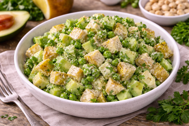Нарежьте огурец, грушу и авокадо, добавьте зелёный горошек и заправьте нежным соусом из кешью — и за 10 минут получится свежий салат без мяса, который хочется есть и есть. Лёгкий, яркий и очень современный, он отлично подойдёт и к обеду, и к ужину, и просто как полезный перекус.