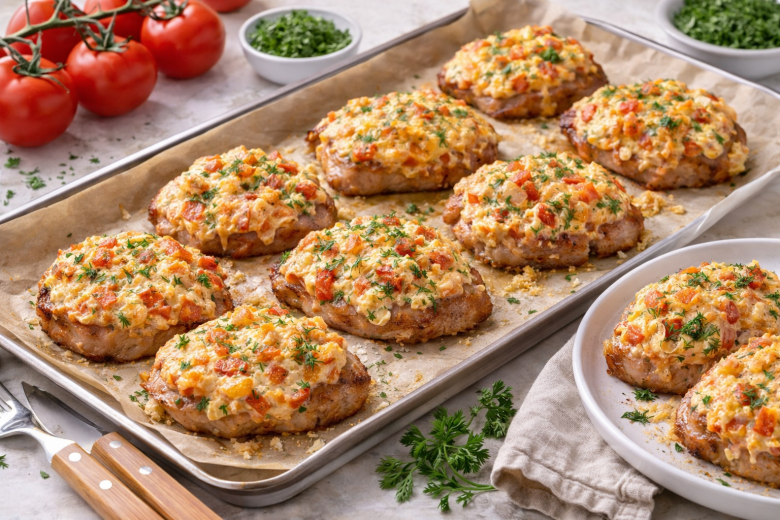Лук обжаривают на растительном масле до золотистого цвета, в конце добавляют измельченный чеснок и полностью остужают. Остывший лук соединяют с нарезанными кубиками томатами, укропом, майонезом и яйцом, хорошо перемешивают до однородного соуса. Свиную шейку нарезают порционными кусочками, обваливают в муке с солью и выкладывают на противень с пергаментом, слегка смазанным маслом. Сверху равномерно распределяют соус. Запекают при 180 °C с конвекцией около 15–25 минут до румяной корочки и полной готовности мяса.
