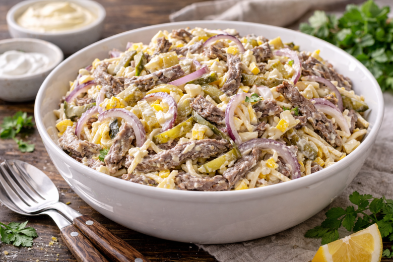 Приготовление: отварную говядину нарежьте тонкой соломкой и слегка разберите волокна вилкой — так салат будет особенно нежным. Маринованные огурцы нарежьте соломкой, красный лук — тонкими полукольцами. Сыр и варёные яйца натрите на крупной тёрке. Сложите все ингредиенты в глубокую миску, добавьте сметану и майонез, аккуратно перемешайте. Солить не нужно — сыра и огурцов вполне достаточно. Дайте салату постоять 15–20 минут в холодильнике — вкус станет ещё более насыщенным. Такой салат всегда выручает, когда хочется вкусного без лишних хлопот.