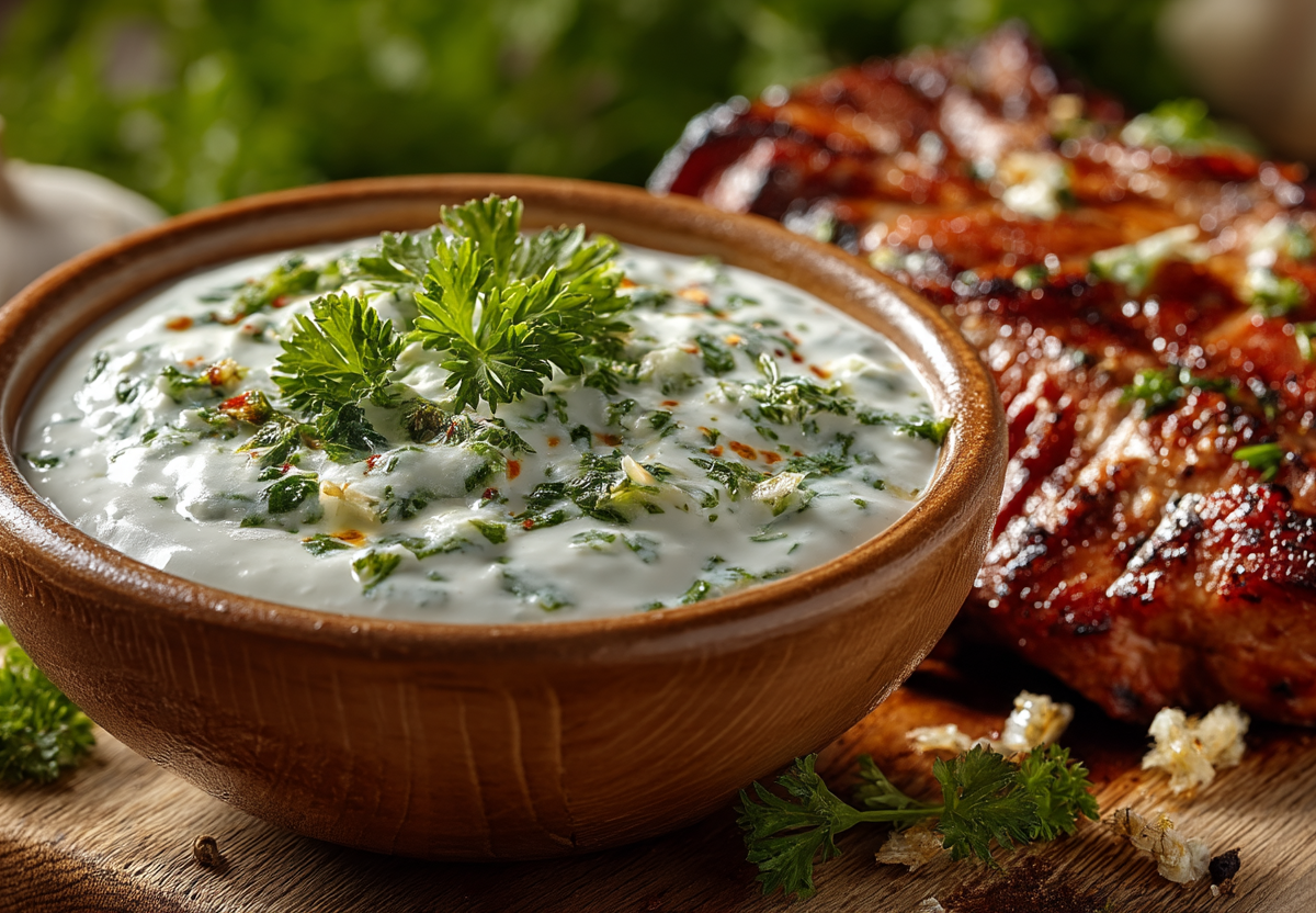 Получается обалденная вкуснятина: густой кремовый соус с легкой остринкой аджики, чесночным ароматом и свежей ноткой петрушки, который подчеркивает вкус мяса и делает его еще сочнее.