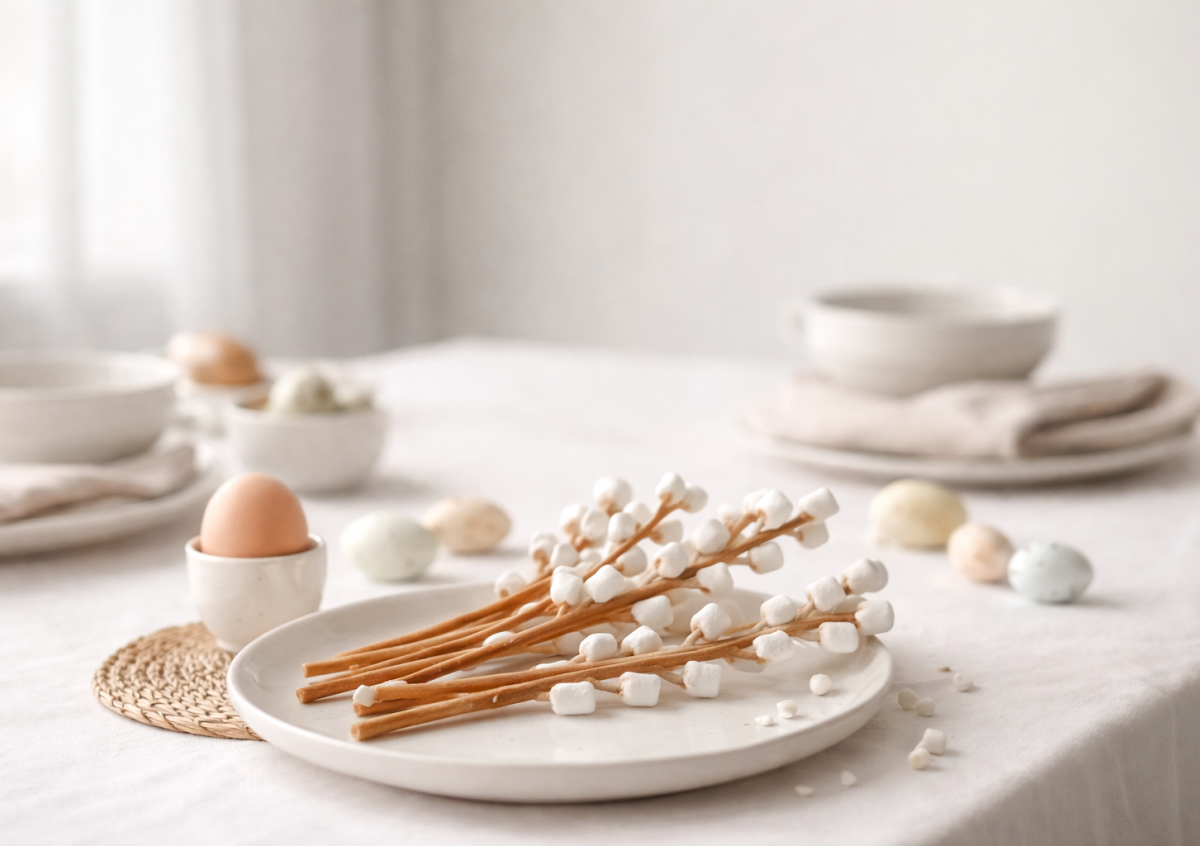 Беру соломку и маршмеллоу — и за несколько минут создаю съедобную вербу, которая украсит пасхальный стол и удивит гостей своей нежностью.