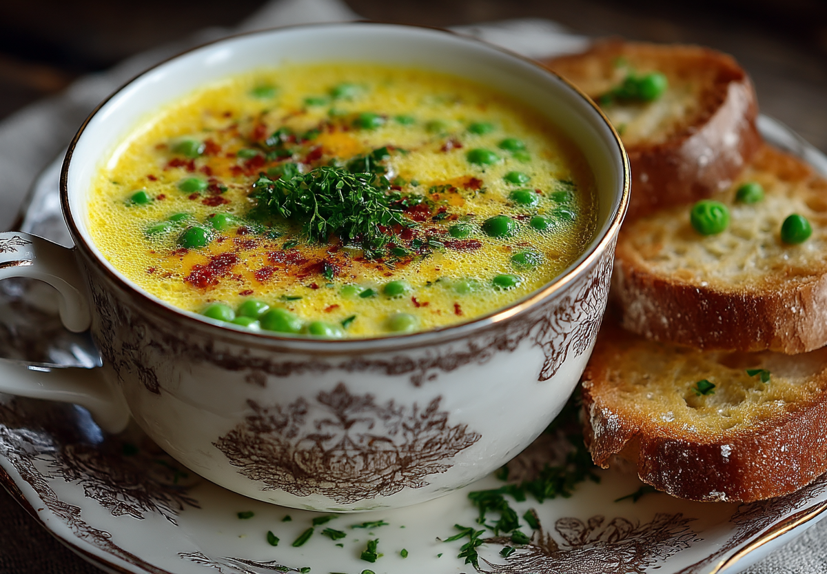 Получается обалденная вкуснятина: нежный, кремовый суп с ароматом расплавленного сыра и сладковатым вкусом зеленого горошка, а легкая кислинка от рассола придает ему свежесть.
