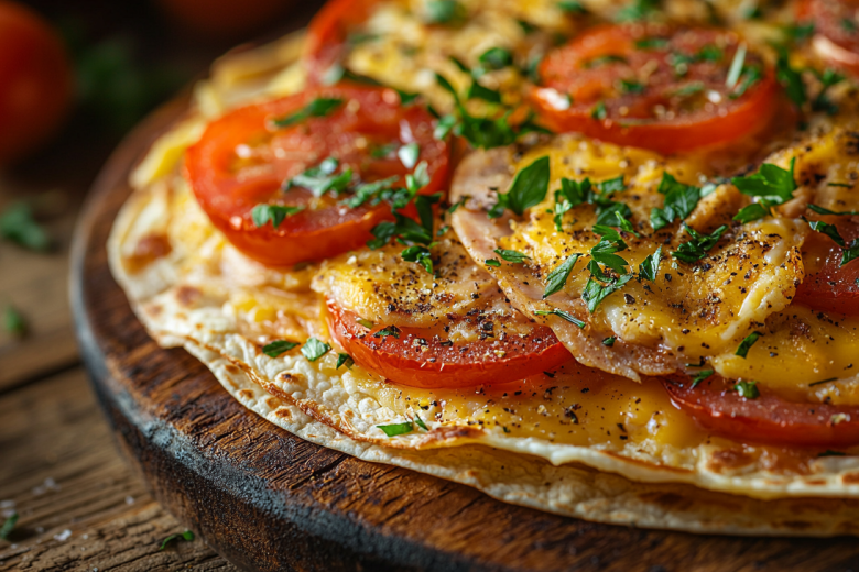 Вам понадобится: 2–3 яйца, 1 круглый тонкий лаваш (или лепешка), 50–70 г тертого сыра, несколько листьев салата, 1 помидор, соль, перец, растительное масло. Разогрейте большую сковороду на среднем огне, слегка смажьте маслом. Яйца взбейте в миске с солью и перцем. Вылейте яичную смесь на сковороду, распределите в круг. Пока нижняя сторона схватывается, обильно посыпьте всю поверхность тертым сыром. Сверху аккуратно накройте яичный круг лавашом, слегка прижмите. Дайте поджариться 1–2 минуты, затем аккуратно лопаткой переверните всю конструкцию лавашом вниз. У вас получится яично-сырный слой сверху. Снимите сковороду с огня. Теперь на одну половину этого «блина» выложите начинку: листья салата, ломтики помидора, можно добавить ветчину, авокадо или что угодно. Накройте начинку второй половиной.