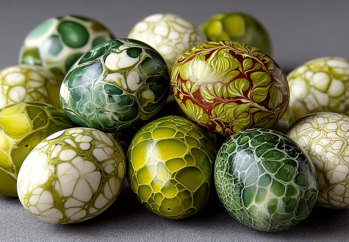 Беру луковую шелуху, капроновые колготки и пузырек зеленки — и уже пятый год подряд крашу яйца на Пасху в шикарной мраморной технике. Получается обалденная красота: каждое яйцо покрывается причудливым узором из зеленовато-красно-желтых разводов, будто его снесла сказочная жар-птица.