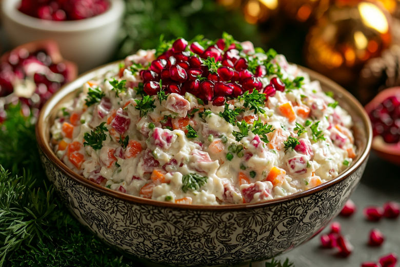 Вкус получается насыщенным и сбалансированным: нежная говядина, свежая редька, сладковатая морковь и сливочная заправка создают гармонию, а зерна граната добавляют сочные сладковато-кислые ноты и праздничный вид. Это сытное и эффектное блюдо для любого застолья.