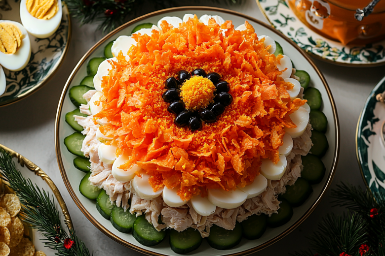 Впечатляющий салат для любого праздника — готовлю слоеный «Подсолнух» с чипсовой «короной»
