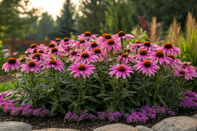 Этот удивительный многолетник поражает своими крупными соцветиями с выпуклой сердцевиной и яркими лепестками всех оттенков розового, малинового, оранжевого и даже зеленого цвета. Эхинацея не просто хорошо приживается в нашем климате — она исключительно морозостойка, выдерживает до −40 °C и прекрасно чувствует себя как в засушливое лето, так и в дождливые периоды.