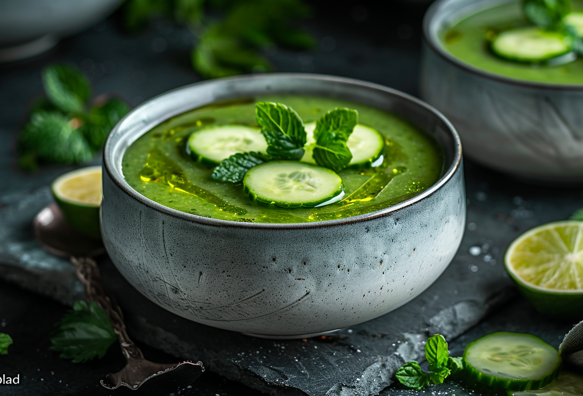 Этот яркий холодный суп — лучший вариант для знойного дня. Его нежная текстура и насыщенный вкус покорят даже тех, кто не любит традиционные томатные гаспачо. Для приготовления понадобится 2 спелых огурца, очищенных от кожуры, 1 авокадо, 50 граммов свежего шпината, 2 столовые ложки оливкового масла, 1 зубчик чеснока, сок половины лайма, щепотка соли и 100 миллилитров ледяной воды.
