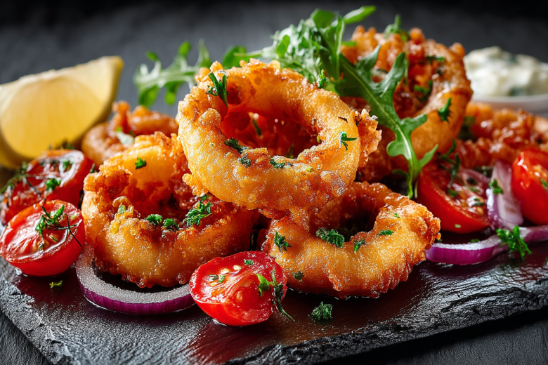 400 г очищенных кальмаров промываю, обсушиваю и нарезаю кольцами. Половину красной луковицы шинкую полукольцами, 150 г помидоров черри разрезаю пополам. В миске сбрызгиваю кальмары соком половины лимона, оливковым маслом, добавляю любимые специи (паприка, черный перец, соль отлично) и хорошо перемешиваю. Затем обваливаю каждый кусочек в панировочных сухарях темпура (нужно 3-4 ст. л.). На противень, застеленный пергаментом, выкладываю кальмары в один слой, а рядом — лук и черри, которые тоже слегка сбрызгиваю маслом. Отправляю в разогретую до 200 °C духовку всего на 10–12 минут, пока панировка не станет золотистой, а кальмары не приготовятся, но останутся сочными. Подаю сразу, пока хрустит!
