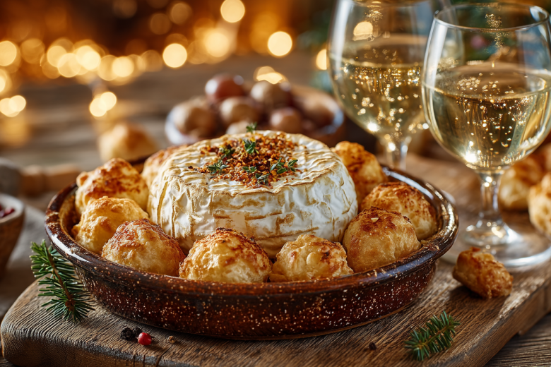 Слоеное тесто разморозьте, нарежьте на квадратики со стороной 5–6 см. В центр каждого квадратика положите шарик моцареллы, соберите края теста к центру и плотно защипните, формируя мешочек. У камамбера снимите упаковку и бумажную обертку, положите его в центр противня. Сделайте в сыре сверху несколько надрезов, вставьте в них тонкие пластинки чеснока, посыпьте специями. Вокруг камамбера разложите слоеные шарики. Смажьте шарики взбитым яйцом. Запекайте в разогретой до 200 °C духовке 15–20 минут до золотистого цвета теста. Подавайте закуску горячей.