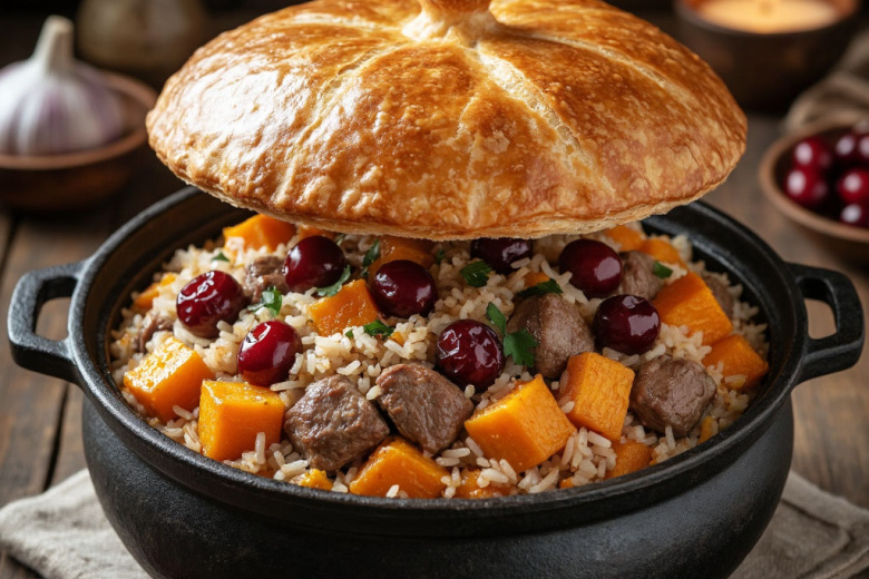 Получается обалденная вкуснятина: нежнейшая телятина, ароматный рис, кусочки сладковатой тыквы и пикантная кислинка кизила, все это объединено под хрустящей золотистой лепешкой-крышкой из теста.