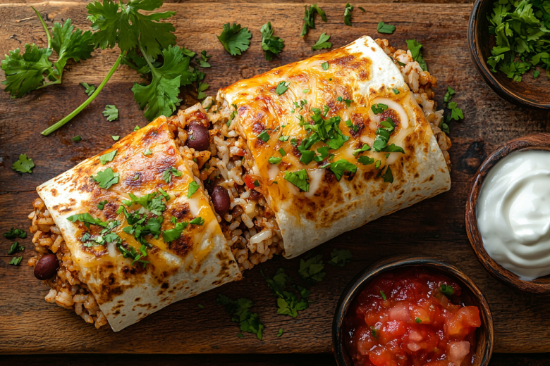 400 г мясного фарша обжариваю на сковороде с растительным маслом, добавляю специи (кумин, чили, паприка), соль и измельченный чеснок по вкусу. Когда мясо подрумянится, добавляю нарезанную кубиками луковицу и болгарский перец, нарезанный соломкой. Тушим 5–7 минут до мягкости овощей. Затем вмешиваю полбанки фасоли в томатном соусе и прогреваю. 1 стакан промытого риса слегка обжариваю на сухой сковороде, заливаю 1,5 стакана воды, добавляю 2 ст. л. кетчупа, щепотку куркумы и соль. Довожу до кипения, затем убавляю огонь и варю под крышкой до готовности риса и впитывания жидкости. Тортилью смазываю смесью сметаны и острого соуса. По центру выкладываю слой риса, затем мясную начинку с фасолью, сверху — нарезанные помидоры и тертый сыр. Края тортильи заворачиваю внутрь, затем плотно скручиваю рулет. Обжариваю буррито на сухой сковороде или гриле по 1–1,5 минуты с каждой стороны до появления золотистых полос и хрустящей корочки. Подаю горячим.