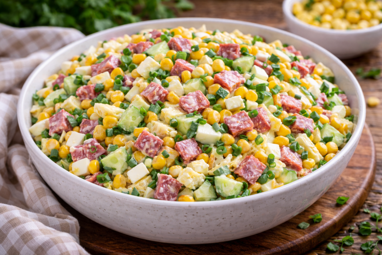 Этот салат «Любимый» покоряет своей простотой и вкусом с первой ложки. Нежные яичные блинчики, сочная колбаса, свежий огурец и сладкая кукуруза создают идеальное сочетание. Готовится быстро, выглядит аппетитно и отлично подходит и для будней, и для праздника.