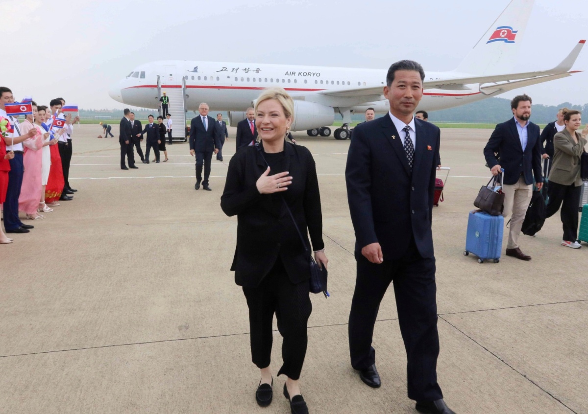 Министры культуры КНДР Сын Чон Гю и России Ольга Любимова во время встречи в международном аэропорту Сунан Министры культуры КНДР Сын Чон Гю и России Ольга Любимова во время встречи в международном аэропорту Сунан Фото: AP/ТАСС