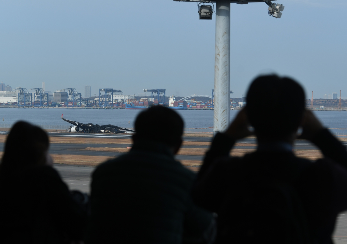 Пассажиры смотрят на обломки рейса 516 JAL после столкновения самолетов в аэропорту Ханэда в Токио Пассажиры смотрят на обломки рейса 516 JAL после столкновения самолетов в аэропорту Ханэда в Токио Фото: Yue Chenxing/XinHua/Global Look Press