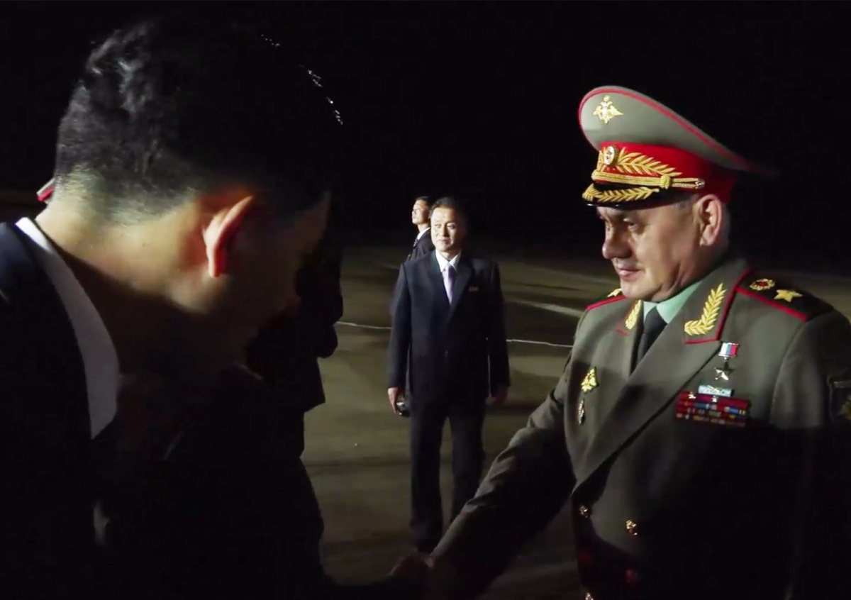 Шойгу приветствовали на стоянке перед аэровокзалом. Там развевались флаги двух стран, стоял почетный караул. Одна из женщин-военнослужащих КНДР преподнесла российскому министру букет цветов. Российской делегации также выразили «боевой привет и полную поддержку».