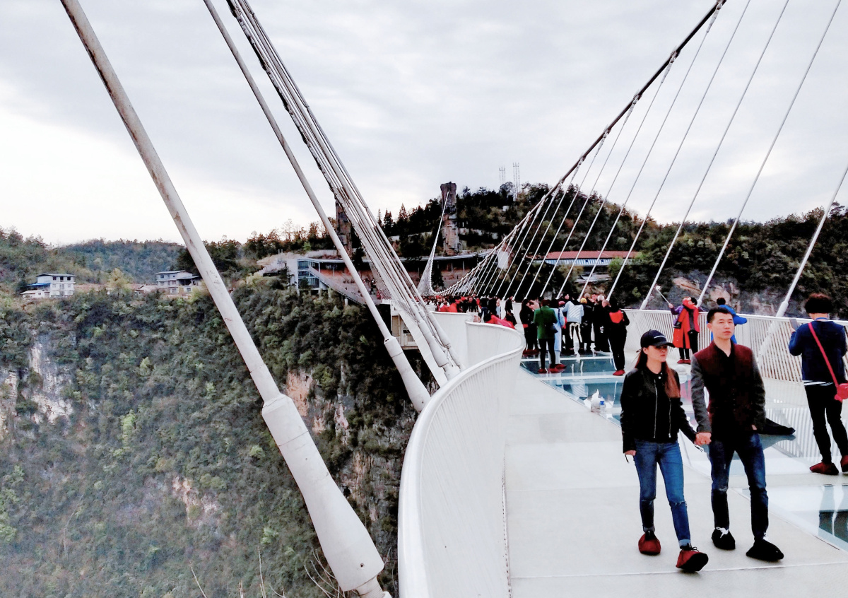 Стеклянные строения стали популярны после возведения моста в провинции Хунань. В 2016 году он был признан самым длинным и высоким стеклянным мостом в мире. Его протяжённость составляет 430 метров, он расположен на высоте 300 метров над землёй. Мост регулярно закрывается по время дождя, поскольку передвижение по нему в такие моменты является опасным для жизни: поверхность делается чрезвычайно скользкой. Об этом сообщает «Интерфакс» со ссылкой на китайские СМИ.