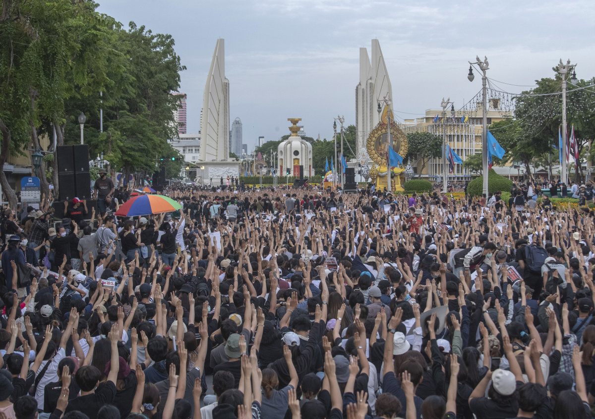 Более тысячи человек вышли на акцию протеста против правительства к Монументу свободы в Бангкоке.