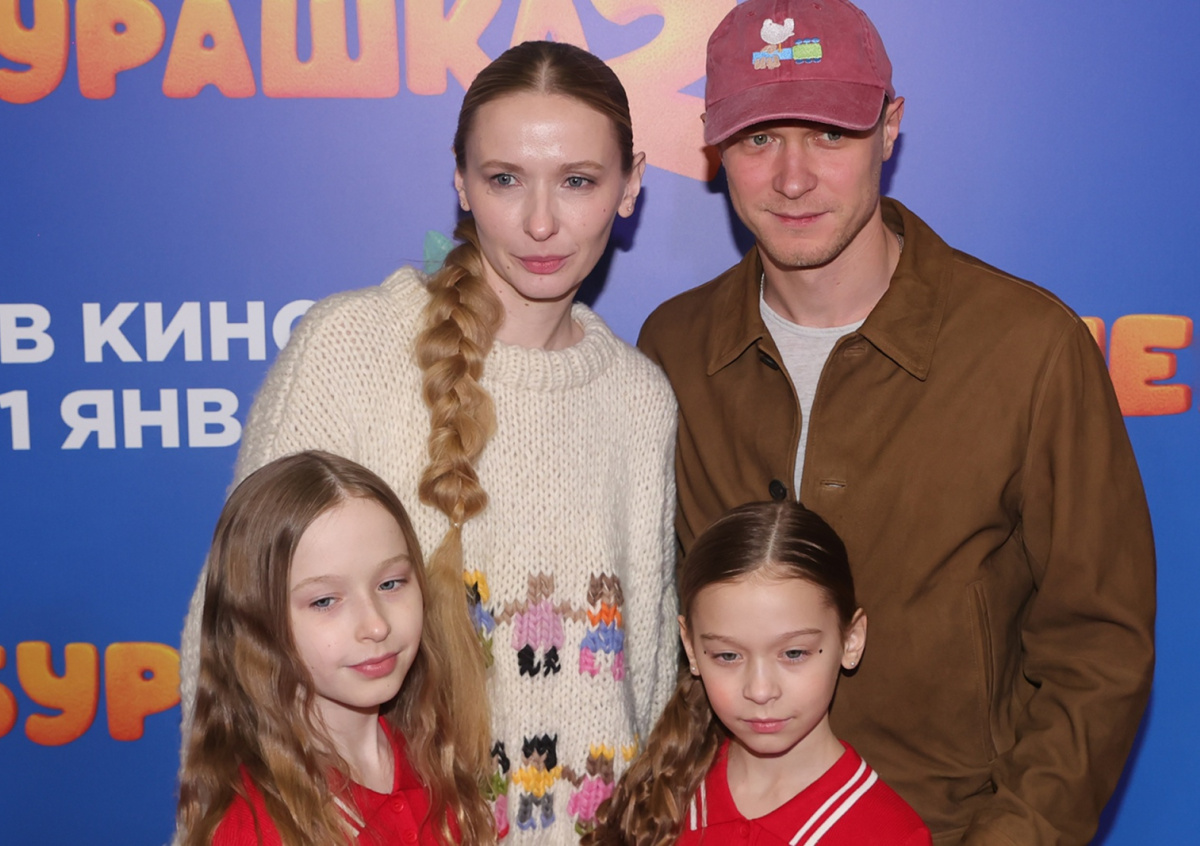 Юрий Борисов с супругой актрисой Анной Шевчук и дочерьми Марфой и Акулиной на премьере фильма «Чебурашка-2»
