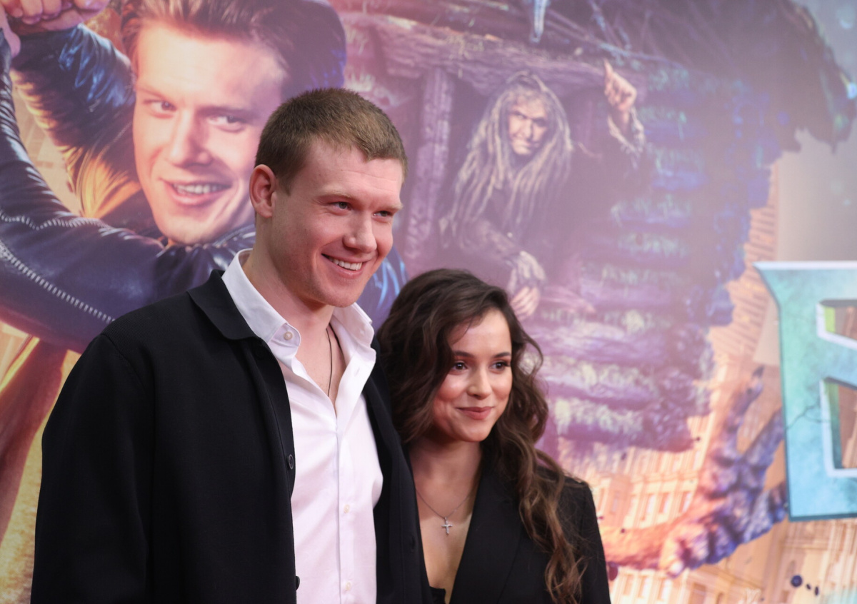 Актёры Виктор Хориняк и Мила Сивацкая на премьере фильма Последний богатырь: Посланник Тьмы режиссёра Дмитрия Дьяченко в кинотеатре Каро 11 Октябрь
