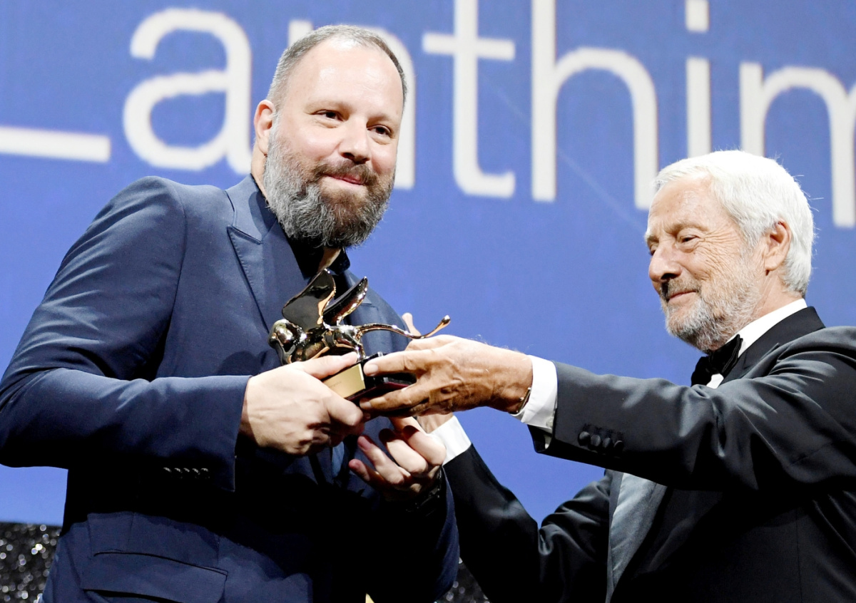 Венеция: греческий режиссер Йоргос Лантимос (слева) и президент биеннале Роберто Чикутто (справа) держат награду «Золотой лев» за фильм «Бедные-несчастные» во время церемонии закрытия 80-го ежегодного Венецианского международного кинофестиваля