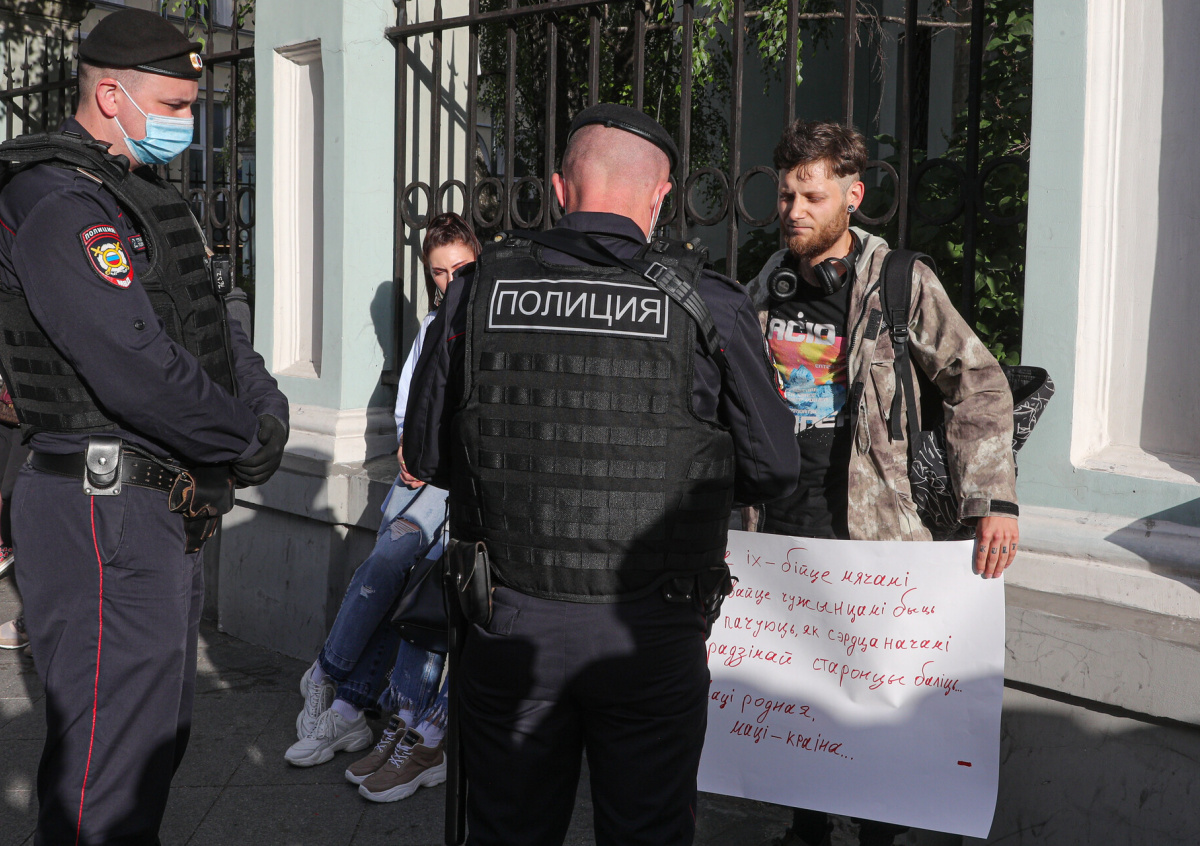 Полиция задержала одного из протестующих у посольства Белоруссии в Москве
