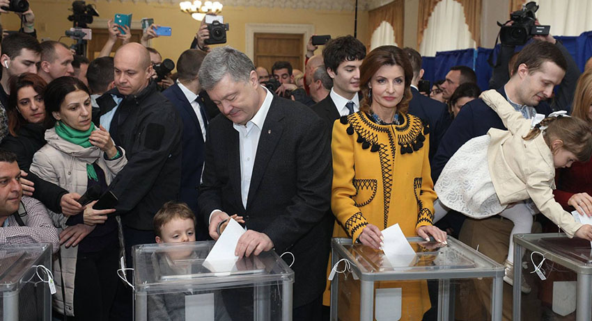 Действующий президент Украины Пётр Порошенко с супругой проголосовал на избирательном участке в Центральном доме офицеров в Киеве.