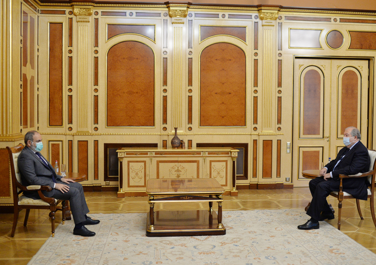По инициативе Саркисяна сегодня в резиденции президента состоялась рабочая встреча с исполняющим обязанности премьер-министра Николом Пашиняном. В ходе встречи были рассмотрены вопросы, связанные с ситуацией на армяно-азербайджанской границе, процессов вывода подразделений вооруженных сил Азербайджана, проникнувших на суверенную территорию Армении, а также шаги, направленные на недопущение посягательств на территориальную целостность Армении, — говорится в сообщении на сайте президента.
