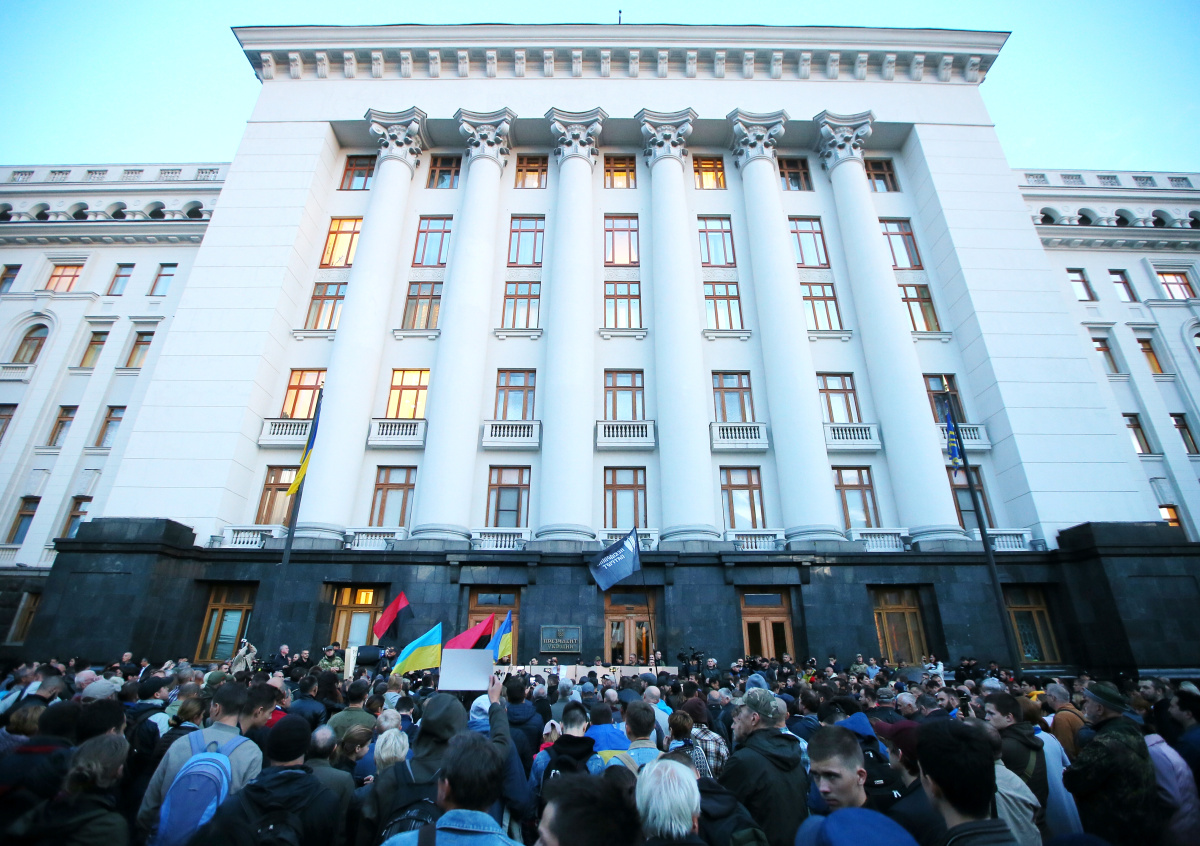 Несколько десятков человек собрались у офиса президента Украины Владимира Зеленского, митингуя против «капитуляции» — разведения противоборствующих сторон с линии соприкосновения в Донбассе.