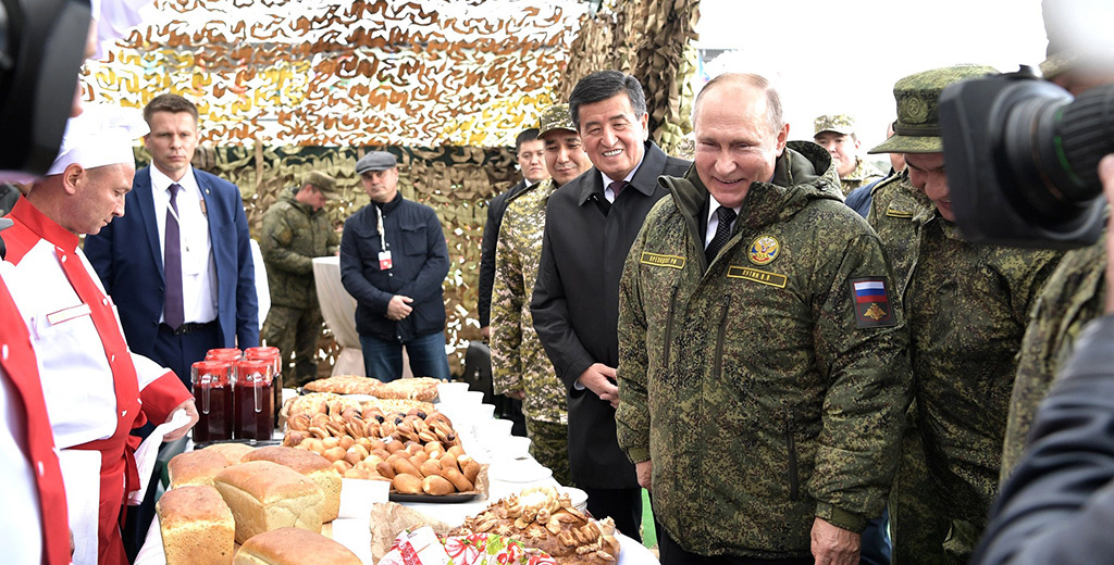 Как передаёт «Политика сегодня», рядом с командно-наблюдательным пунктом выставили столы с выпечкой. Президенты РФ и Киргизии вместе с главой Минобороны Сергеем Шойгу и начальником Генштаба Вооружённых сил РФ Валерием Герасимовым взяли по куску свежего хлеба и по чашке чая. После чаепития российский лидер поблагодарил пекарей рукопожатием.