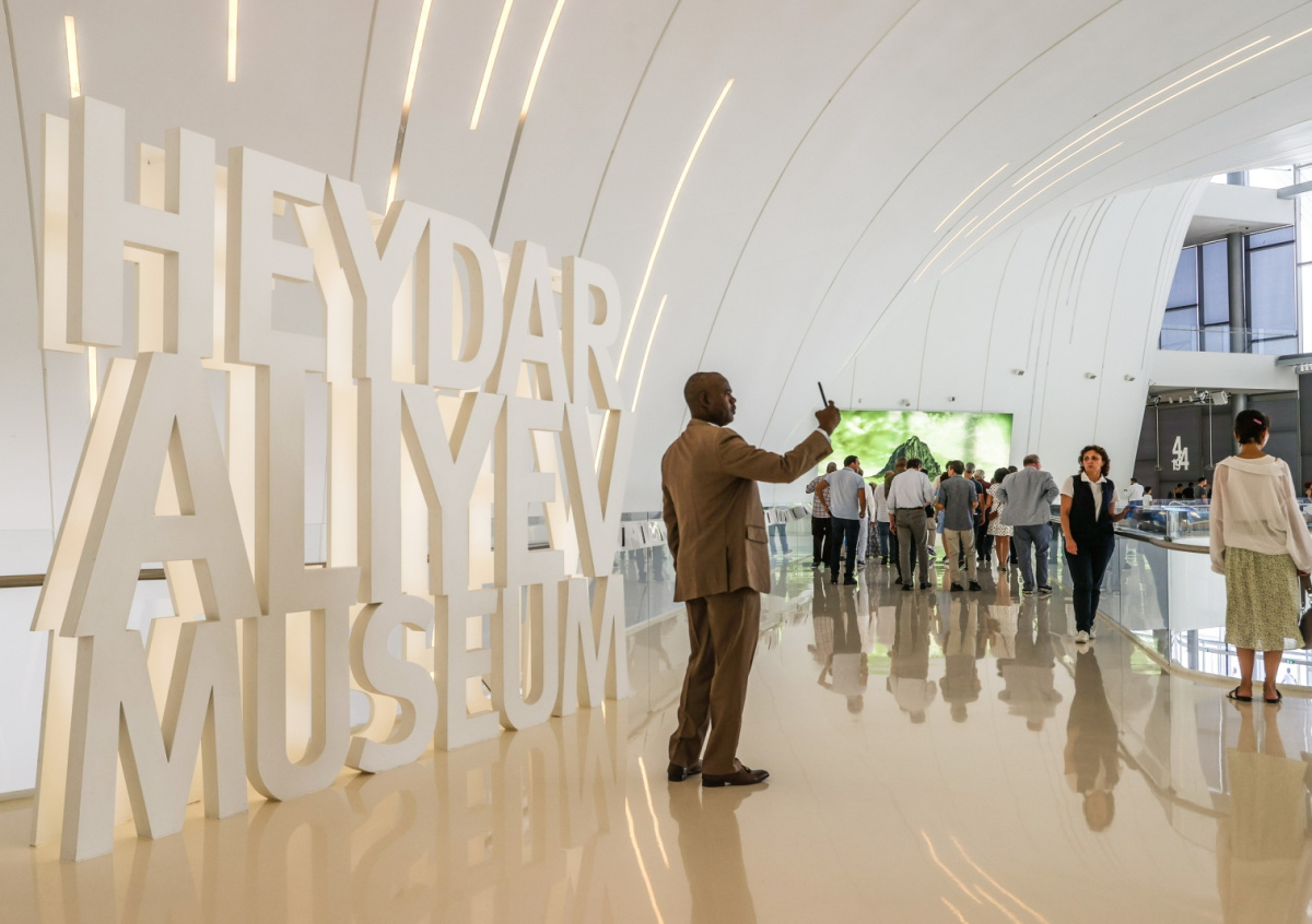 Посетители в музейном центре Гейдара Алиева в Баку, Азербайджан