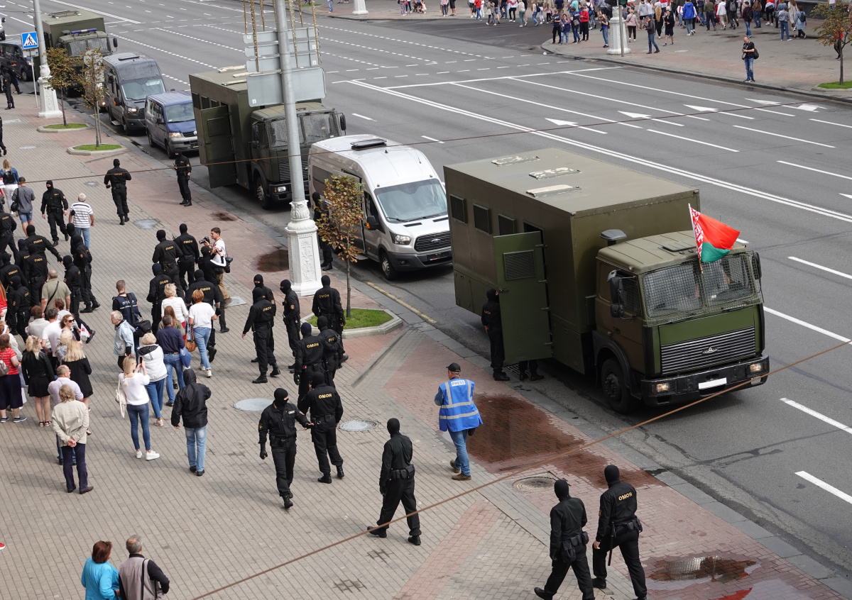 В Минске 13 сентября проходит очередная акция протеста. По словам очевидцев, в ней принимают участие более 150 тысяч протестующих. Митингующие сформировали несколько крупных колонн. Одна из них пошла по проспекту Независимости в направлении резиденции главы Белоруссии Александра Лукашенко. Люди заблокировали движение транспортных средств на перекрёстке проспекта Машерова — бульвара Космонавтов, поэтому для их разгона милиция использовала водомёт.