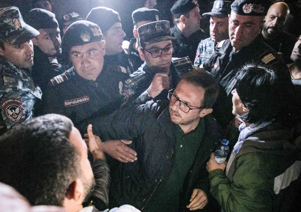 По данным армянской полиции, один участник протестной акции задержан, у него изъяты два ножа. Согласно опубликованным кадрам, протестующие требуют отставки премьер-министра страны Никола Пашиняна. На плакате одного из них надпись гласит: «Пашинян, уходи. Арцах, соединяйся».