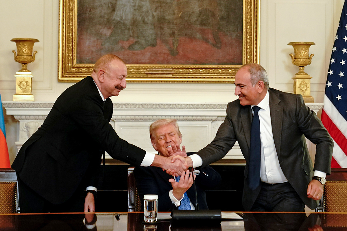 Президент Азербайджана Ильхам Алиев (слева направо), президент США Дональд Трамп и премьер-министр Армении Никол Пашинян во время церемонии подписания соглашения в Вашингтоне Президент Азербайджана Ильхам Алиев (слева направо), президент США Дональд Трамп и премьер-министр Армении Никол Пашинян во время церемонии подписания соглашения в Вашингтоне Фото: Nathan Howard — Pool via CNP/Keystone Press Agency/Global Look Press