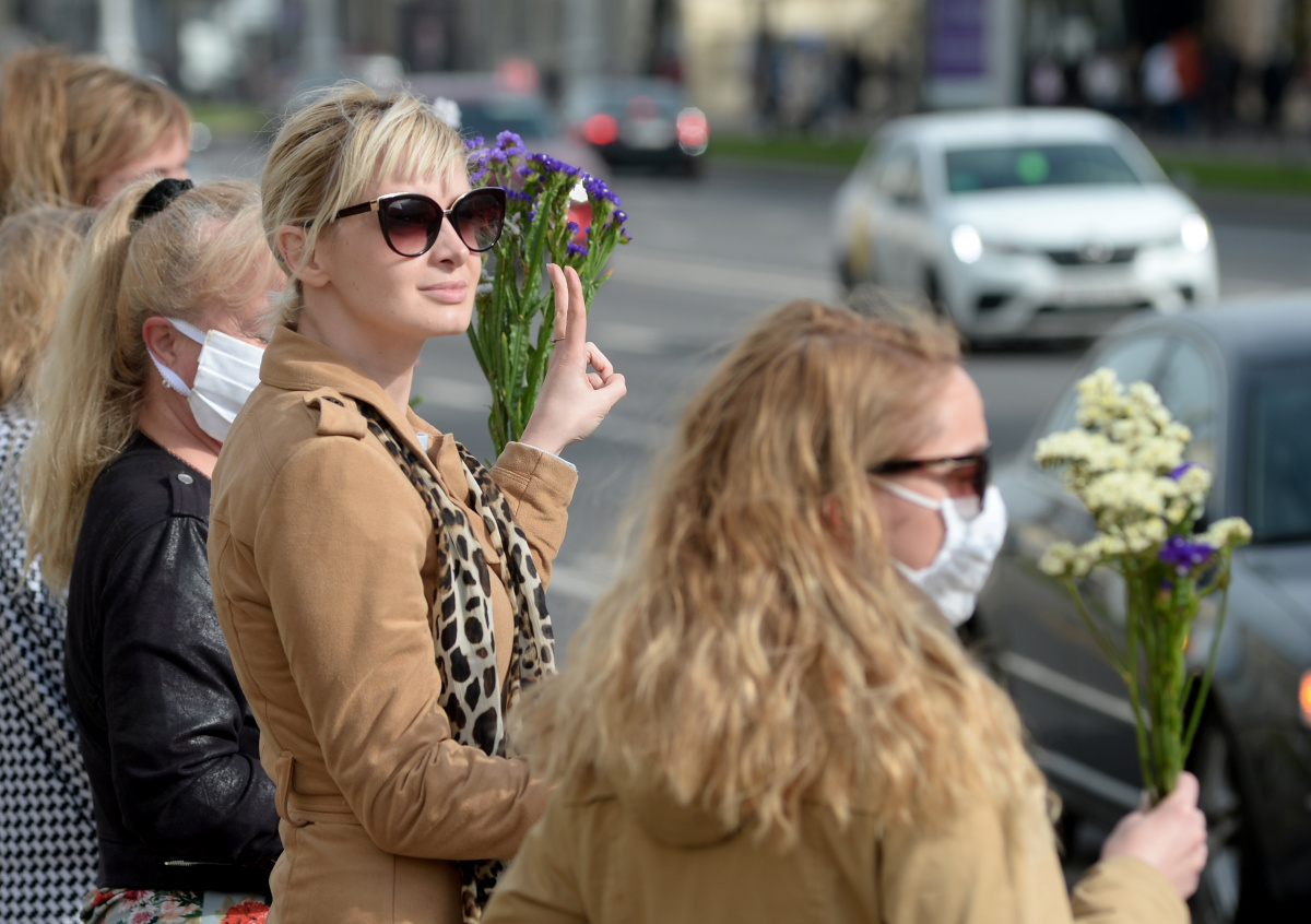 В Минске сегодня проходит очередная акция из серии женских протестов. В этот раз белоруски не стали выстраиваться в цепи солидарности или проводить марш. Они гуляют по столице небольшими группами с цветами в руках, а также с бело-красной атрибутикой, которая стала символом протеста.