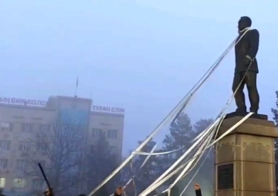 В Талдыкоргане протестующие предприняли попытку снести памятник бывшему президенту Казахстана Нурсултану Назарбаеву, сообщает информационное агентство КазТАГ. Отмечается, что под пение и лозунги на казахском языке пикетчики набросили на монумент верёвки и попытались стянуть его вниз.