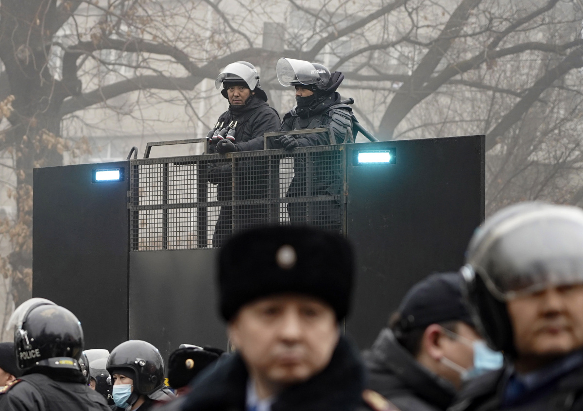 Казахстан. Алма-Ата. Сотрудники полиции во время акции протеста против повышения цен на сжиженный газ Казахстан. Алма-Ата. Сотрудники полиции во время акции протеста против повышения цен на сжиженный газ Фото: EPA/STR/ТАСС