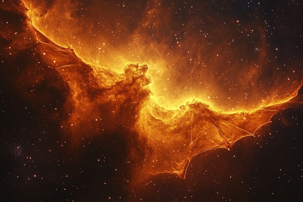 Астрономы Европейской южной обсерватории (ESO) по случаю Хеллоуина опубликовали снимок гигантского облака газа и пыли, форма которого напоминает летучую мышь с расправленными крыльями, парящую в космическом пространстве. Уникальный кадр был получен при помощи телескопа обзора VLT в обсерватории Паранал в пустыне Атакама.