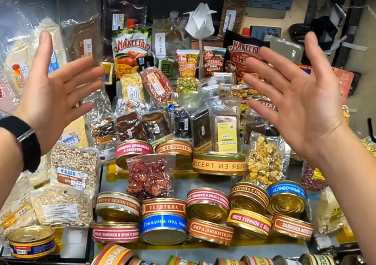 Кикина показала набор продуктов для космонавтов на МКС — туда входят мясо консервированное и вяленое мясо, творог, хлеб, орехи, овощи и сухофрукты, сублимированные салаты и напитки: кисель, кофе, чай (он также есть в заваренном виде). Помимо того, в рацион космонавтов входят супы, такие как борщ, щи, харчо и рассольник, а также различные десерты, соусы и даже жвачка.