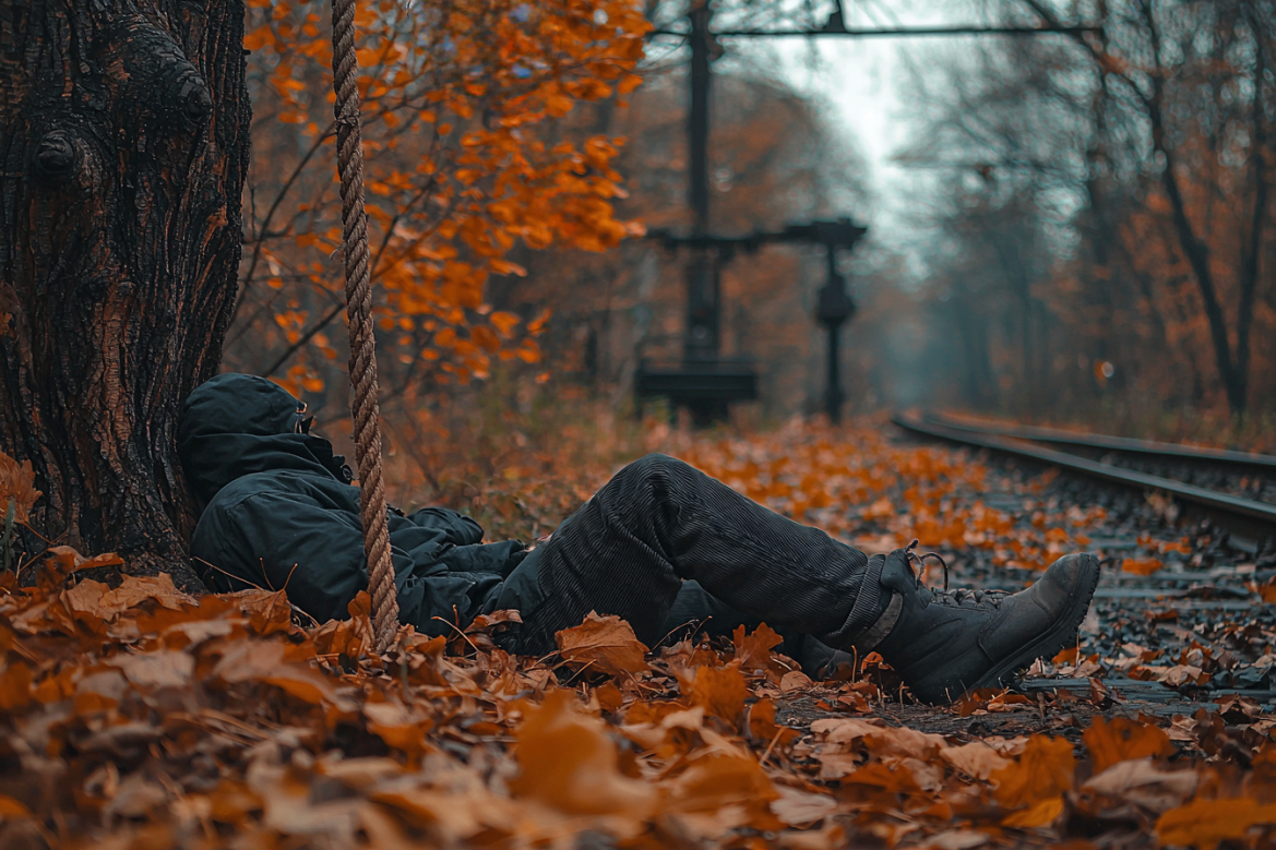 «При работе на перегоне, ну, с пути увидели — на дереве висит веревка. Рядом труп человека, голова оторвана. Веревка такая крепкая, видно. [Человек] одет в черную куртку, штаны, сапоги, джинсы, штаны вельветовые, черные. Сиденька вот такая приличная рядом. Да, неприятно это, конечно, видеть. Тело уже объеденное, вырвана голова. Веревка профессионально завязана. В общем, вот такие дела», — говорит голос за кадром.