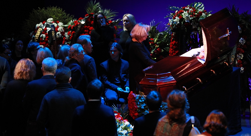 Гроб с телом было решено поставить на сцене. Рядом с ним находятся члены семьи и близкие. Возле лежат многочисленные венки, люди несут живые цветы, среди которых много роз.