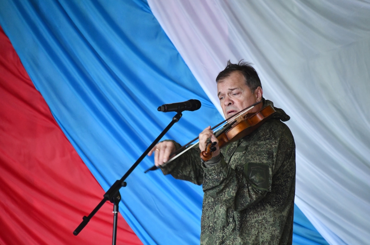 Музыкант, экс-скрипач легендарной рок-группы «Аквариум», основатель и художественный руководитель Международного фестиваля барочной музыки EARLYMUSIC Андрей Решетин выступает перед бойцами в зоне СВО на Херсонском направлении, 2022 год