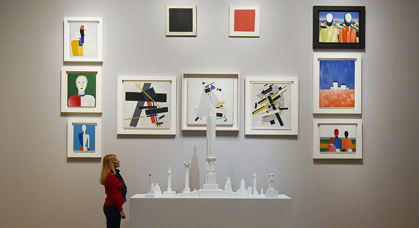 Представленная в Катаре экспозиция включает более 150 работ художника, среди них — «Красный квадрат», «Скачет красная конница», «Автопортрет».