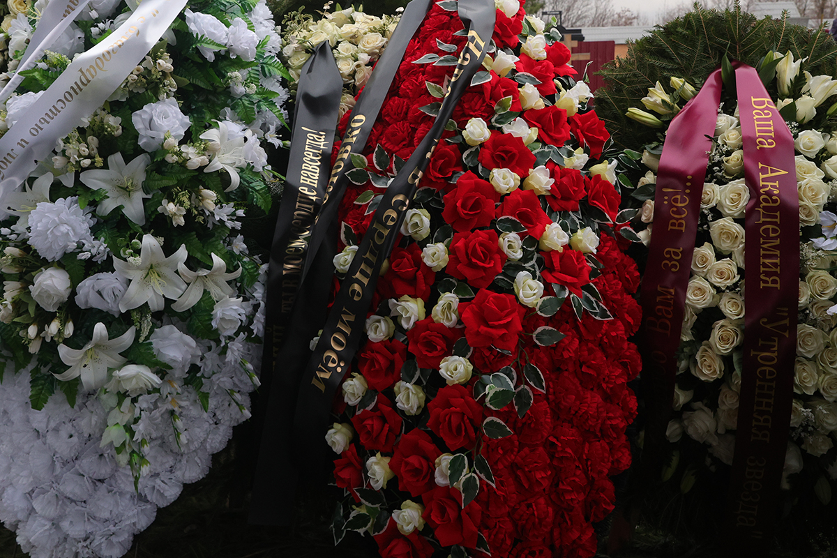 Также цветы отправили гендиректор Первого канала Константин Эрнст, группа «Любэ» и телеведущий Андрей Малахов. Рядом стоял венок с белыми цветами от супруги телеведущего Элеоноры, на траурной ленте которого было написано: «Мой любимый, ты в моем сердце навсегда. Твоя супруга Ляля».