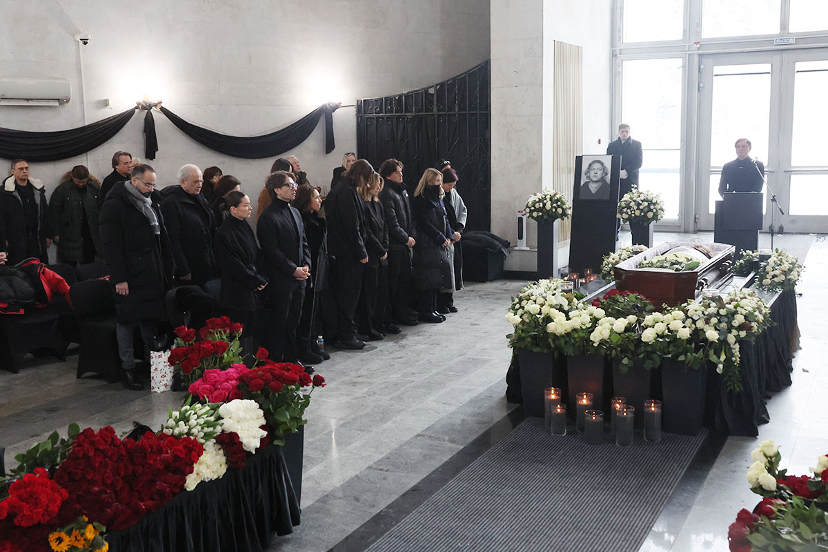 На кадрах виден гроб, усыпанный цветами, преимущественно красными и белыми розами, и многочисленные венки. Церемония прощания продлится до 15:00 мск. Олейникова похоронят на Троекуровском кладбище.