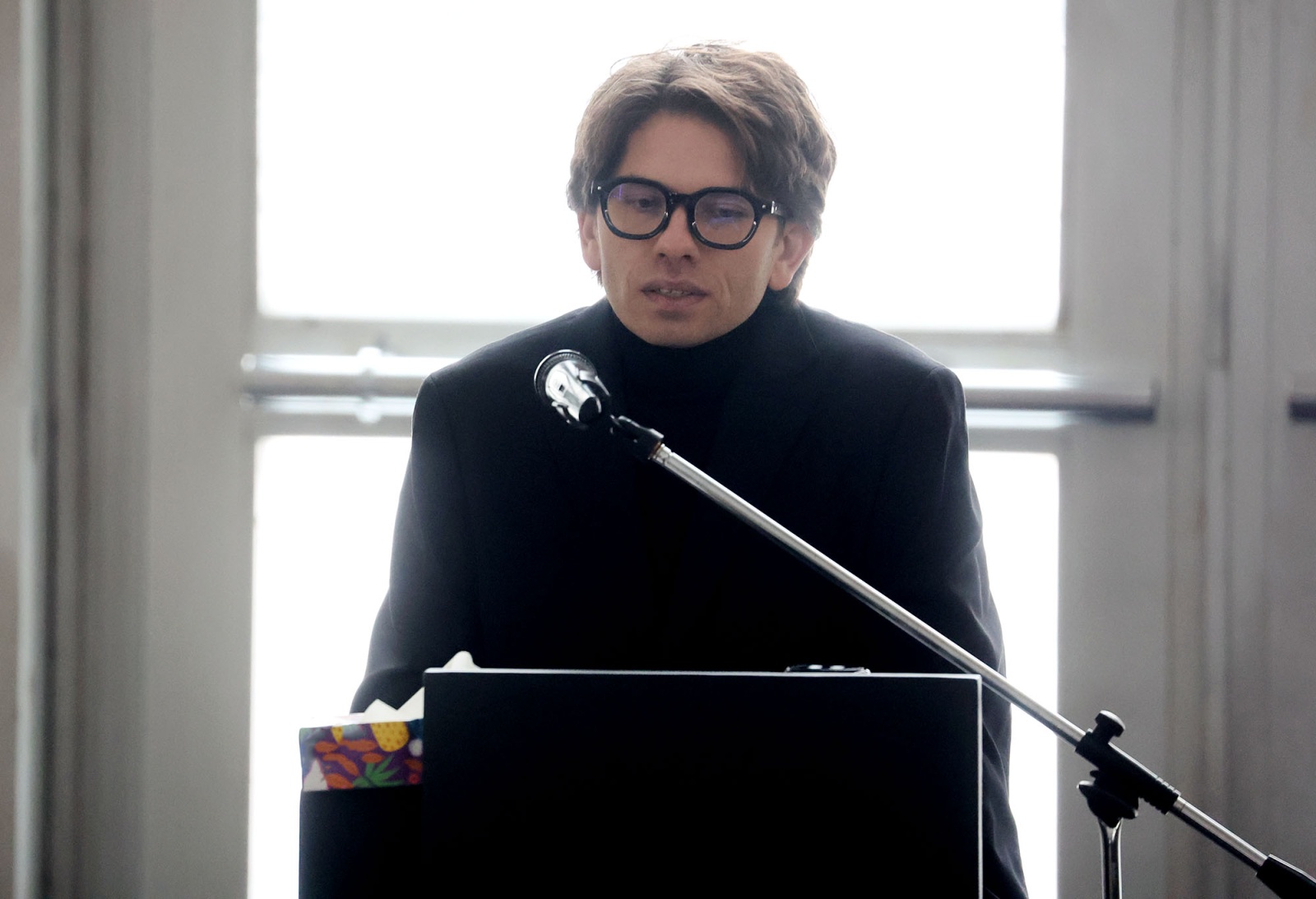 Максим Олейников на церемонии прощания с продюсером и телеведущим Александром Олейниковым в прощальном зале Троекуровского кладбища