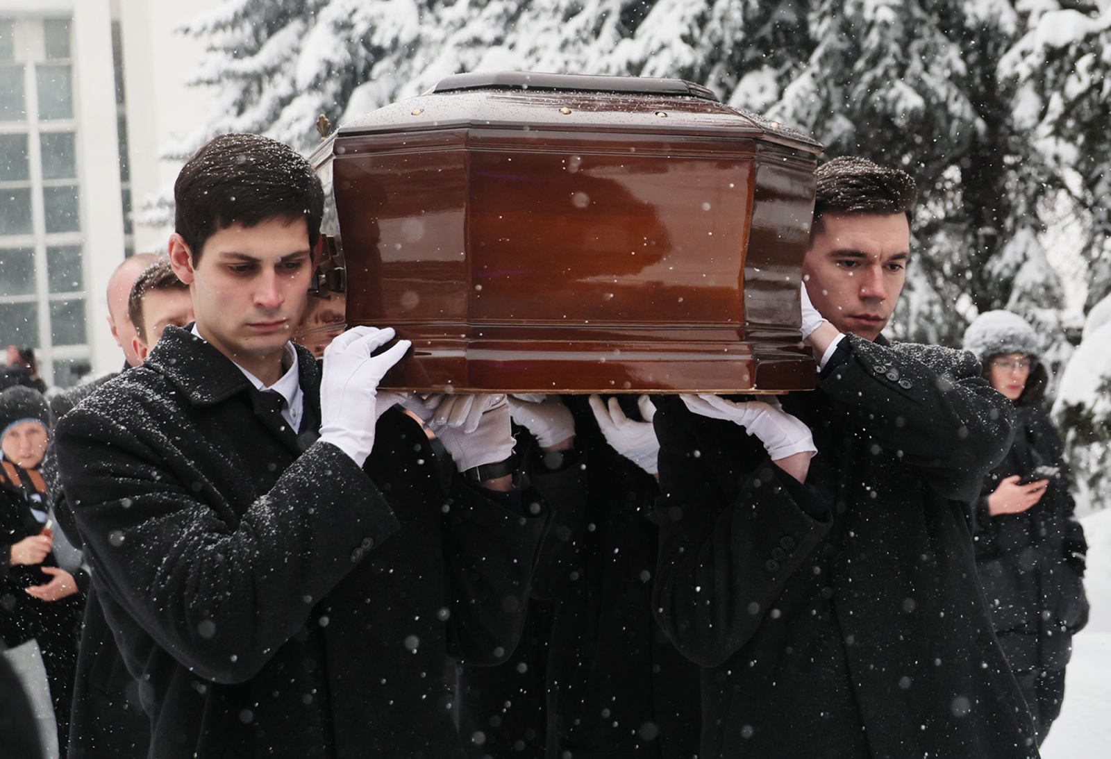 Вынос гроба с телом продюсера и телеведущего Александра Олейникова после церемонии прощания на Троекуровском кладбище